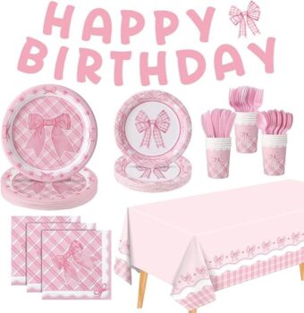 - מכילה את כל מה שדרוש: מפה, שלט "יום הולדת שמח", צלחות אוכל, צלחות קינוח, כוסות, סכינים, מזלגות, כפיות ומפיות.