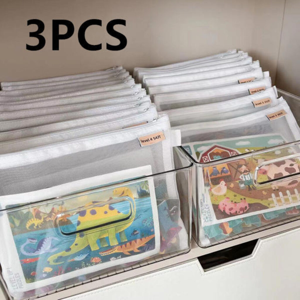 שקיות אחסון שקופות חזקות עם רוכסן מהוות פתרון מצוין לאחסון צעצועים ופאזלים.